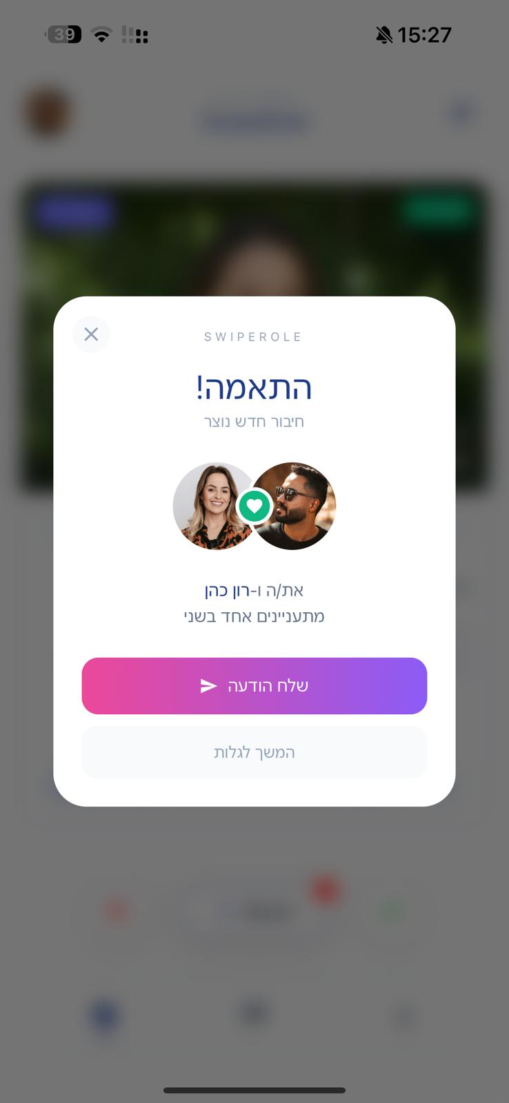 SwipeRole היא אפליקציית גיוס חדשנית שמחברת בין מועמדים למעסיקים בסגנון Swipe. מועמדים מחליקים על משרות, מעסיקים מחליקים על מועמדים, וכשיש התאמה הדדית - נפתח צ'אט ישיר.